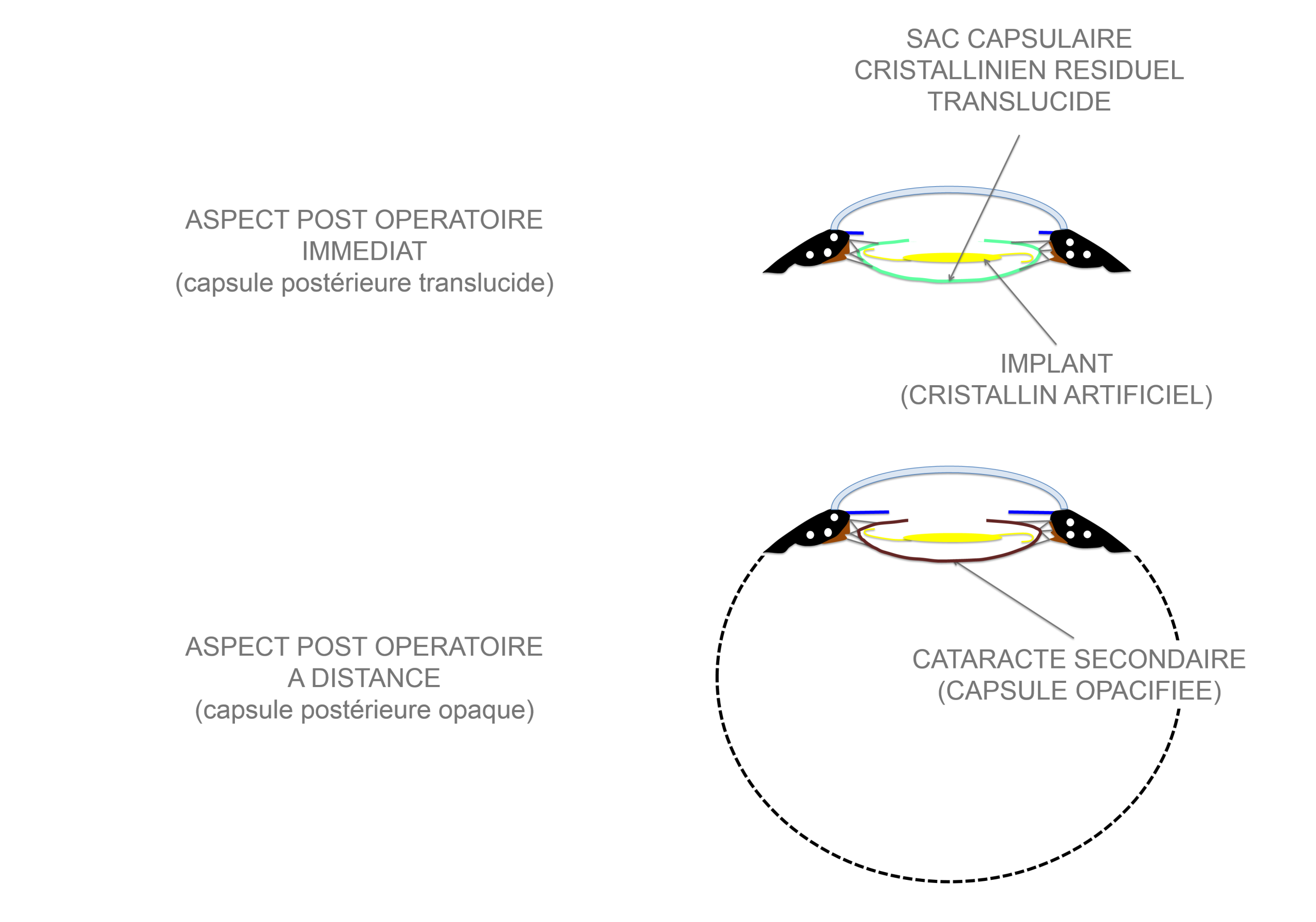 Après le traitement LASER des corps flottants correspondant aux débris de la capsule peuvent être perçus le temps de leur résorption. Des collyres anti-inflammatoires sont prescrits pour quelques jours.